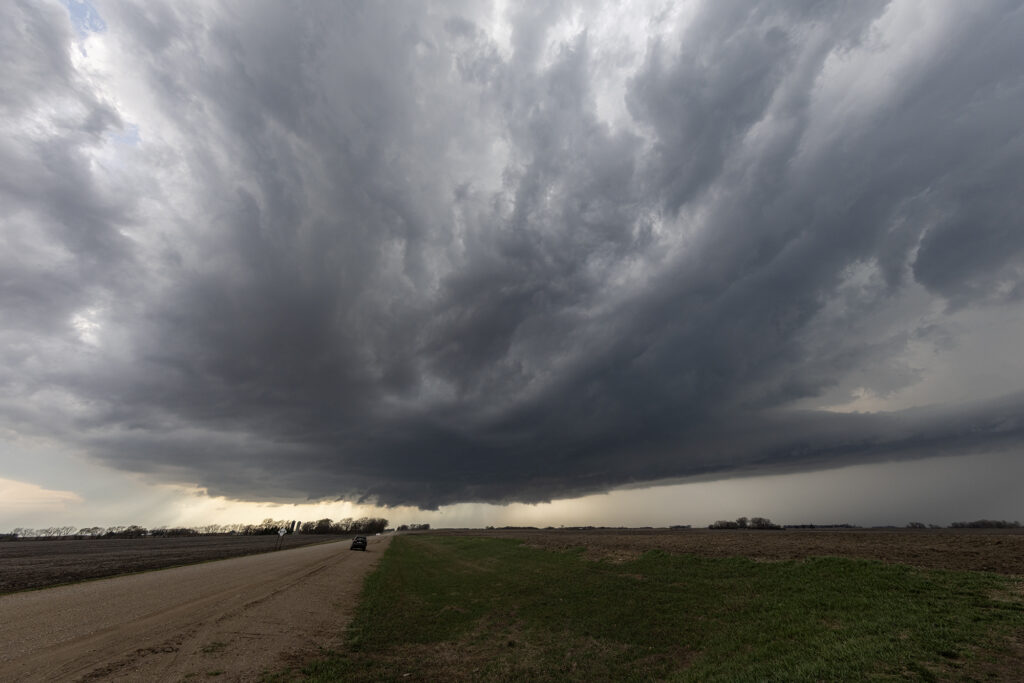 April 13th took our on call tour north to a volatile set up along a warm front/triple point over southern Minnesota. Mid afternoon we arrived near Fairmont, MN as the atmosphere became extremely unstable. Several storms developed along the warm front, then crossed it into colder air. These were not tornadic, but produced big hail. Soon, our storm formed west of Truman, MN and anchored on the warm front. You knew that the show was about to begin as it ramped up quickly and grew to over 50,000 feet. A tornado warning we issued as the storm spun had and approached our location. We drifted east with it and a huge bowl shaped lowering formed, and quickly dropped a pretty cone tornado. It stayed on the ground several minutes before lifting. Another elephant trunk shaped tornado formed east of town and was also on the ground for several minutes. It was quite pretty! After it dissipated, a third truncated cone shaped tornado formed and was on the ground for about 5 minutes before lifting. We stayed with the supercell past Minnesota Lake where it continued to be tornado warned, but it did not produce anymore tornadoes. Numerous cell mergers would disrupt the low level mesocyclone until it soon died off. An incredible day with a pretty supercell and 3 tornadoes we were only a mile away from! Enjoy the pics!